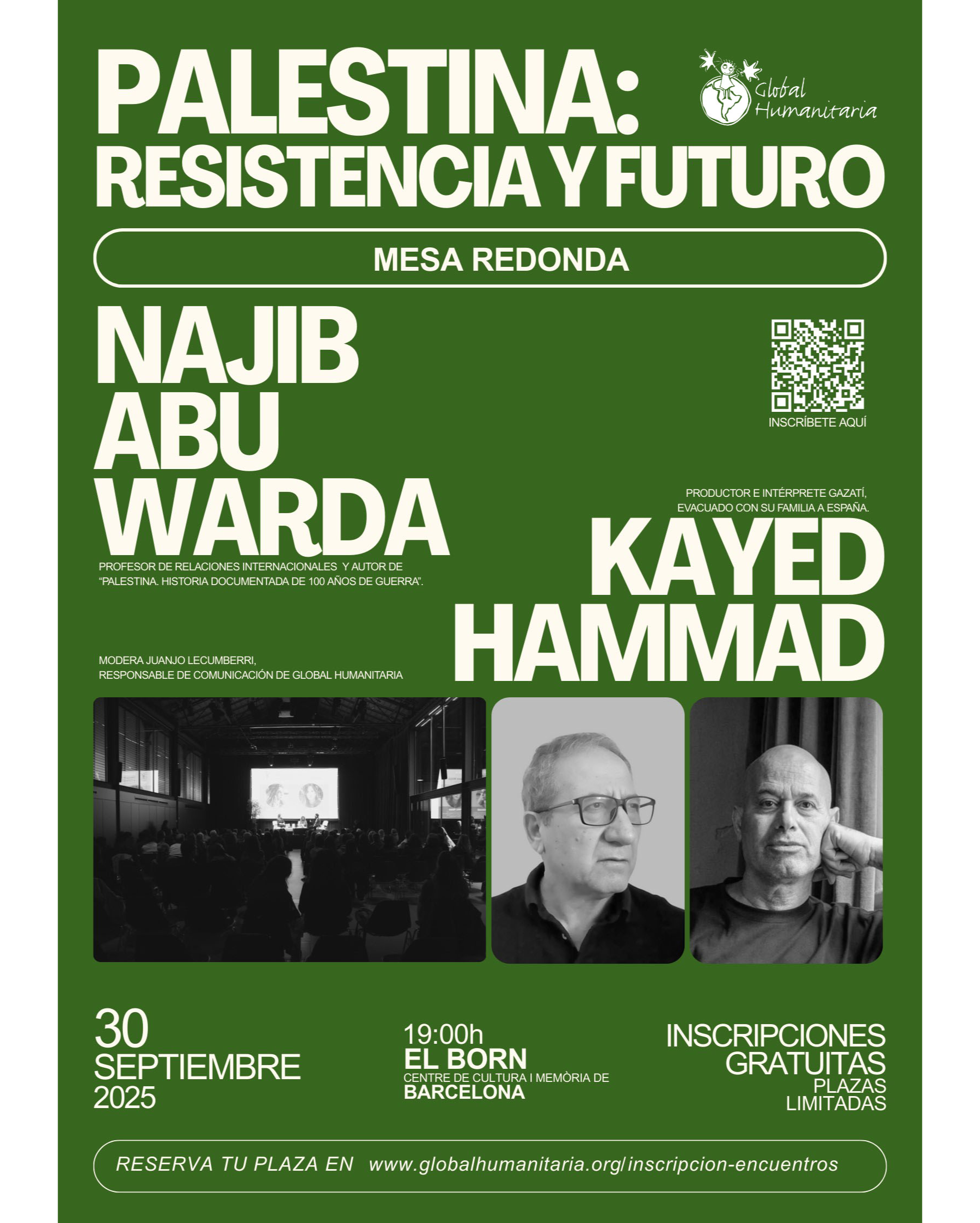 El próximo 30 de septiembre a las 19h, Global Humanitaria organiza una mesa redonda alrededor de la situación de Palestina, con Najib Abu Warda, periodista y profesor de Relaciones Internacionales en la Universidad Complutense de Madrid, y Kayed Hammad, productor e intérprete gazatí, que ha narrado la vida en la Franja bajo los bombardeos israelíes y que recientemente consiguió ser evacuado con su familia a España. La mesa estará moderada por Juanjo Lecumberri, responsable de Comunicación de Global Humanitaria