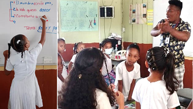 La actividad forma parte de nuestro programa de mejora de la lectoescritura, competencia en las que los escolares de Tumaco muestran grandes dificultades y que lastra todo el resto de aprendizajes. Global Humanitaria capacita en pedagogía de lectoescritura a los docentes que participan en nuestro programa. Ellos son los que se ocupan de guiar a más de 300 alumnos en el manejo del escenario, la declamación y la expresión corporal con ejercicios de lectura en voz alta. En paralelo programan actividades de lectura en casa para fortalecer el acompañamiento de las familias en el aprendizaje de sus hijos.